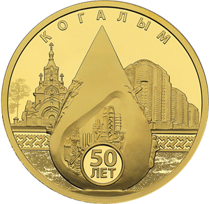 — монеты номиналом 100 рублей расположены рельефные изображения: в центре — скульптурной композиции «Капля жизни», слева — храма святой мученицы Татианы, справа — городских домов; нижнюю часть монеты пересекает рельефная орнаментальная полоса; имеются надписи: вверху по окружности — «КОГАЛЫМ», внизу в круглой рамке в две строки — «50 ЛЕТ».