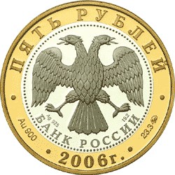 на диске – эмблема Банка России (двуглавый орел с опущенными крыльями, под ним – надпись полукругом «БАНК РОССИИ»), обрамленная кругом из точек, слева – обозначение металла, проба сплава, справа – содержание драгоценного металла в чистоте. На кольце по окружности – надписи: вверху – «ПЯТЬ РУБЛЕЙ», внизу – «2006 г.», слева – обозначение металла, проба сплава, справа – содержание драгоценного металла в чистоте и товарный знак монетного двора.