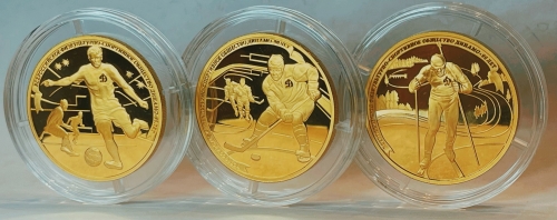 3) Футбол: на зеркальном поле диска на фоне контуров стадиона - рельефное изображение футболиста в момент удара по мячу, на втором плане слева - две фигуры игроков на поле, вверху и справа на светлой полосе вдоль канта - надпись: "ВСЕРОССИЙСКОЕ ФИЗКУЛЬТУРНО-СПОРТИВНОЕ ОБЩЕСТВО ДИНАМО-90 ЛЕТ".