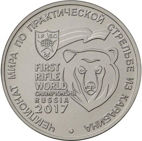 Реверс: Рельефное изображение эмблемы чемпионата мира по практической стрельбе из карабина. Вдоль канта имеется надпись по окружности: «ЧЕМПИОНАТ МИРА ПО ПРАКТИЧЕСКОЙ СТРЕЛЬБЕ ИЗ КАРАБИНА», внизу в центре – точка.