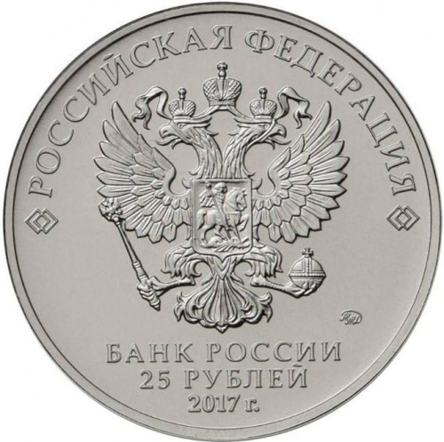 Аверс: Рельефное изображение Государственного герба Российской Федерации, над ним вдоль канта – надпись полукругом: «РОССИЙСКАЯ ФЕДЕРАЦИЯ», обрамленная с обеих сторон сдвоенными ромбами, справа – товарный знак монетного двора, внизу под гербом в центре в три строки – надпись «БАНК РОССИИ», номинал монеты: «25 РУБЛЕЙ», год: «2017 г.».