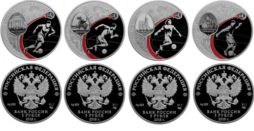 Аверс всех монет: на зеркальном поле диска – рельефное изображение Государственного герба Российской Федерации, над ним вдоль канта – надпись полукругом: "РОССИЙСКАЯ ФЕДЕРАЦИЯ", обрамленная с обеих сторон сдвоенными ромбами, внизу под гербом: слева – обозначения драгоценного металла и пробы сплава, справа – содержание химически чистого металла и товарный знак монетного двора, внизу в центре в три строки – надпись: "БАНК РОССИИ", номинал монеты: "3 РУБЛЯ", год: "2018 г.".