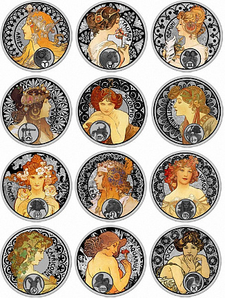 Серебряные, памятные монеты из серии "А. Муха Знаки Зодиака (состоящий из 12 монет) , выпущены Филателическим и нумизматическим Бюро Ниуэ , являющимся официальным эмиссионным органом Правительства Острова Ниуэ , в связи со 150 годовщиной со дня рождения этого великого художника.