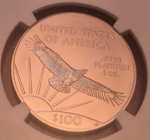 Аверс: Изображен орел в полете на фоне восходящего из-за линии горизонта солнца и его лучей. Сверху стоит надпись в две строки: «UNITED STATES OF AMERICA» (Соединенные Штаты Америки). Справа сверху от орла находятся следующие обозначения в три строки: «.9995 PLATINUM 1 OZ.» (проба 0.9995, платина, 1 унция). На стилизованном изображении земли внизу стоит информация о номинале: «$100» (100 долларов).