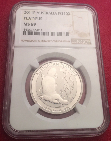 Аверс: изображен плывущий под водой утконос вокруг водорослей и пузырей. По кругу — надписи: «Australian Platypus» (Австралийский Утконос), год выпуска монеты, вес - 1 oz (1 тройская унция), проба - 9995 Platinum (0,9995 чистой платины).