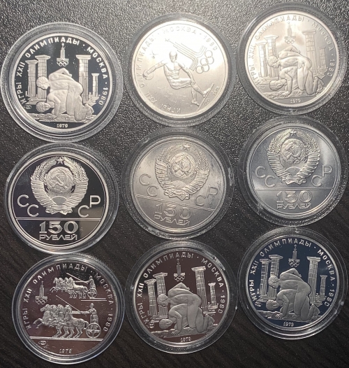 В рамках подготовки к XXII летним Олимпийским играм 1980 года в Москве, впервые в СССР были выпущены монеты из платины. В 1977-1980 было отчеканено 5 памятных монет на олимпийскую тематику (аверс — герб СССР и номинал монеты 150 рублей, реверс — фрагменты Античных Олимпийских игр) тиражами от 12 до 24 тысяч шт. каждая, в двух вариантах — proof и uncirculated.