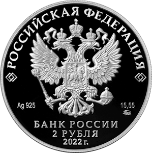 рельефное изображение Государственного герба Российской Федерации, над ним вдоль канта – надпись полукругом: «РОССИЙСКАЯ ФЕДЕРАЦИЯ», обрамленная с обеих сторон сдвоенными ромбами, под гербом: слева – обозначения драгоценного металла и пробы сплава, справа – содержание химически чистого металла и товарный знак монетного двора, внизу в центре в три строки – надпись: «БАНК РОССИИ», номинал монеты: «2 РУБЛЯ», год выпуска: «2022 г.».
