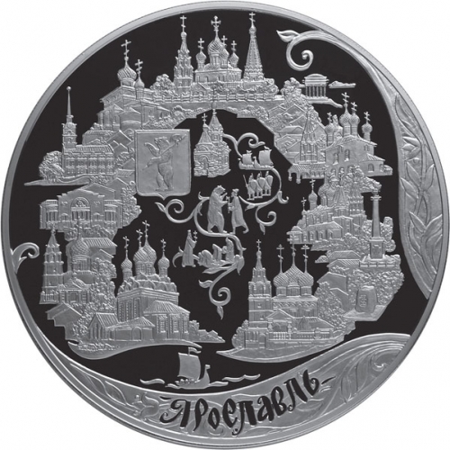 в обрамлении растительного орнамента - архитектурная панорама города Ярославля: ансамбли церквей, здание театра, ротонда, обелиск, в центре - герб города и сцены бытия древних горожан, на первом плане - парусное судно на реке, внизу - надпись: "ЯРОСЛАВЛЬ".