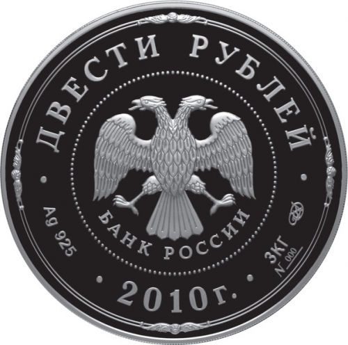 в центре - эмблема Банка России (двуглавый орел с опущенными крыльями, под ним - надпись полукругом "БАНК РОССИИ"), обрамленная кругом из точек и надписями, вверху - номинал: "ДВЕСТИ РУБЛЕЙ", внизу: слева - обозначения драгоценного металла и пробы сплава, в центре - год выпуска "2010 г.", справа в две строки - содержание химически чистого металла, товарный знак монетного двора и порядковый номер монеты №__, вдоль канта – две концентрические линии с четырьмя декоративными элементами.