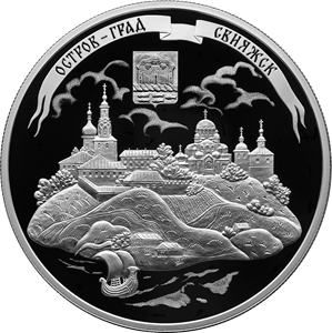 рельефные изображения: в центре — острова-града Свияжска, внизу слева — деревянного корабля, вверху — герба Свияжска, вверху по окружности — ленты с надписью: «ОСТРОВ-ГРАД СВИЯЖСК».