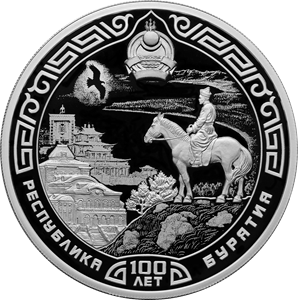 рельефные изображения герба Республики Бурятия, конного всадника в бурятском национальном костюме, здания Государственного русского драматического театра имени Н.А. Бестужева и верхушек лиственниц, а также выполненные в технике лазерного матирования изображения здания Бурятского государственного театра оперы и балета, Иволгинского дацана, силуэта парящего орла, берегов озера Байкал, травы и камней; по окружности – выполненные рельефом традиционный бурятский орнамент и надпись: «РЕСПУБЛИКА БУРЯТИЯ», внизу в две строки – рельефная надпись: «100 ЛЕТ», обрамленная элементами орнамента.