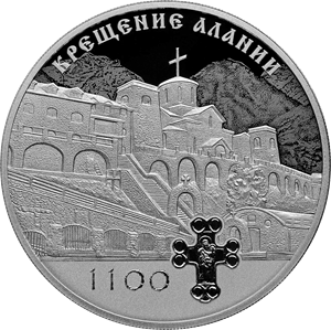 рельефное изображение Аланского Успенского монастыря на фоне выполненного в технике лазерного матирования изображения горного пейзажа; вверху по окружности – рельефная надпись: «КРЕЩЕНИЕ АЛАНИИ», внизу, на матированном поле, – изображение традиционного аланского креста и надпись «1100», выполненные полированным рельефом.