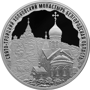 рельефное изображение Холковского монастыря; вдоль канта на стилизованном рельефном фоне, фактурой напоминающем беленые стены Холковских пещер, надпись: «СВЯТО-ТРОИЦКИЙ ХОЛКОВСКИЙ МОНАСТЫРЬ БЕЛГОРОДСКАЯ ОБЛАСТЬ».