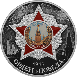 выполненное в цвете рельефное изображение ордена «Победа» на фоне изображений Кремля и праздничного салюта; внизу вдоль канта — надпись: «ОРДЕН «ПОБЕДА», над ней — дата: «1945».