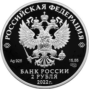 рельефное изображение Государственного герба Российской Федерации, над ним вдоль канта – надпись полукругом: «РОССИЙСКАЯ ФЕДЕРАЦИЯ», обрамленная с обеих сторон сдвоенными ромбами, под гербом: слева – обозначения драгоценного металла и пробы сплава, справа – содержание химически чистого металла и товарный знак монетного двора, внизу в центре в три строки – надпись: «БАНК РОССИИ», номинал монеты: «2 РУБЛЯ», год выпуска: «2022 г.».