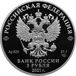 на зеркальном поле диска — рельефное изображение Государственного герба Российской Федерации, над ним вдоль канта — надпись полукругом: «РОССИЙСКАЯ ФЕДЕРАЦИЯ», обрамленная с обеих сторон сдвоенными ромбами, внизу под гербом: слева — обозначения драгоценного металла и пробы сплава, справа — содержание химически чистого металла и товарный знак монетного двора, внизу в центре в три строки — надпись: «БАНК РОССИИ», номинал монеты: «3 РУБЛЯ», год выпуска: «2021 г.».