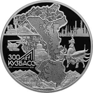 на зеркальном поле диска — рельефные изображения контура Кемеровской области — Кузбасса, логотипа празднования