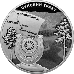 рельефные изображения памятника «Нулевой километр Чуйского тракта» и деревьев на фоне изображений фрагмента карты и панорамного пейзажа Чуйского тракта; вверху вдоль канта — надпись: «ЧУЙСКИЙ ТРАКТ».