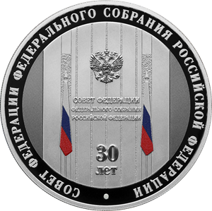 на матовом поле – рельефное изображение стелы из фойе здания Совета Федерации Федерального Собрания Российской Федерации и выполненное в цвете изображение расположенных с двух сторон от стелы флагов Российской Федерации; имеются рельефные надписи: по окружности, разделенная точкой, – «СОВЕТ ФЕДЕРАЦИИ ФЕДЕРАЛЬНОГО СОБРАНИЯ РОССИЙСКОЙ ФЕДЕРАЦИИ», внизу в две строки – «30 ЛЕТ».