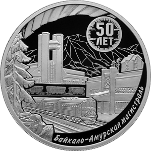 рельефные изображения вокзалов в городе Тынде (слева) и поселке Улькане (справа), электровоза, ели на скале и дома одной из серий, разработанных для поселков БАМ, а также выполненные в технике лазерного матирования стилизованные изображения развевающейся занавески, вагонов грузового состава, гор и леса; рельефные надписи: внизу по окружности – «Байкало-Амурская магистраль», вверху справа в рамке в две строки – «50 ЛЕТ».
