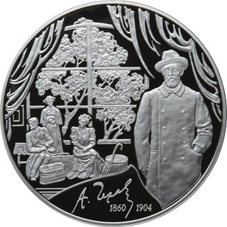 слева - изображения мужчины и женщины, сидящих возле дорожных вещей, и стоящей за ними женщины, на втором плане за окном - цветущее дерево, вверху - стилизованное изображение ниспадающего занавеса, справа - фигура стоящего А.П. Чехова, внизу на зеркальном поле листа бумаги - матовая подпись-факсимиле писателя: "А. ЧЕХОВ" и даты в одну строку: "1860" и "1904".