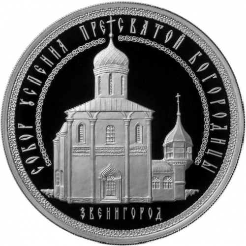в центре диска на зеркальном поле - рельефное изображение одноглавого храма и колокольни, под ними - горизонтальная надпись: "ЗВЕНИГОРОД", вдоль канта на широкой полосе, образованной узким концентрическим орнаментом - надпись полукругом: "СОБОР УСПЕНИЯ ПРЕСВЯТОЙ БОГОРОДИЦЫ".