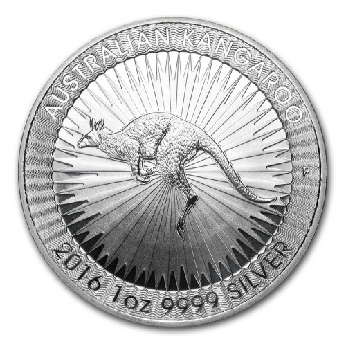 На реверсе серебряной инвестиционной монеты Кенгуру изображен красный кенгуру. Сверху по ободу монеты надпись - Австралийский Кенгуру, снизу - год выпуска монеты (2016), вес (1 тройская унция - 31,1 г), проба серебра в монете (9999). Сбоку видна буква P - знак Пертского монетного двора.