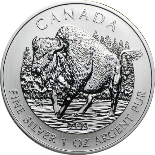 Серебряная унцовая монета бизон, 5 долларов Канада. 2013г.