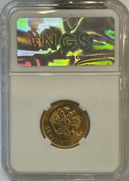 В центре изображен Малый Государственный Герб Российской империи - двуглавый орёл, головы которого увенчаны двумя коронами, третья, большая корона над ними. Все они соединены орденской лентой ордена Св. Апостола Андрея Первозванного. На груди орла расположен Московский герб, в щите изображен Георгий Победоносец с копьем поражающий дракона. Вокруг щита цепь ордена Св. Апостола Андрея Первозванного. На крыльях изображены гербы: Царства Казанского, Польского, Херсонеса Таврического, Астраханского, Сибирского, Грузинского, герб соединенных княжеств Киевского, Новгородского и Владимирского и герб Великого Княжества Финляндского — по 4 на каждое крыло. В правой лапе орла – скипетр, в левой – держава. Под ним слева направо изображены: номинал - надпись «10 РУБЛЕЙ» и дата выпуска «1899 Г.». По окружности канта имеются рельефные элементы, выполненные в виде зубцов.