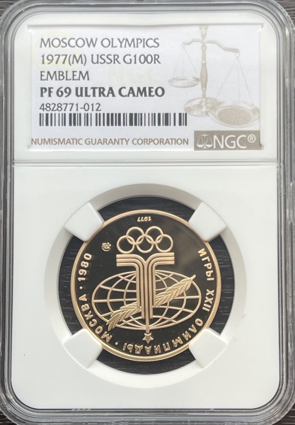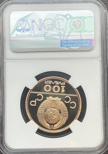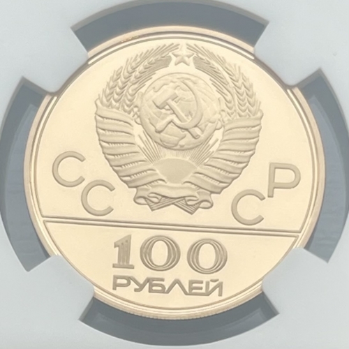 Сверху герб СССР с 15 витками ленты, слева от него буквы «СС», справа «СР», ниже двойная черта, под ней обозначение достоинства монеты цифра «100» и ниже слово «РУБЛЕЙ».