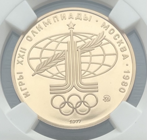 Слева и сверху вдоль канта слова «ИГРЫ XXII ОЛИМПИАДЫ», справа разделенные точкой слово «МОСКВА» и год проведения XXII Олимпиады «1980», в середине эмблема XXII Олимпийских игр и за ней аллегория спорта и мира в виде земного шара и лежащей перед ним лавровой ветви, ниже справа монограмма монетного двора «ММД», внизу у канта год выпуска монеты «1977».
