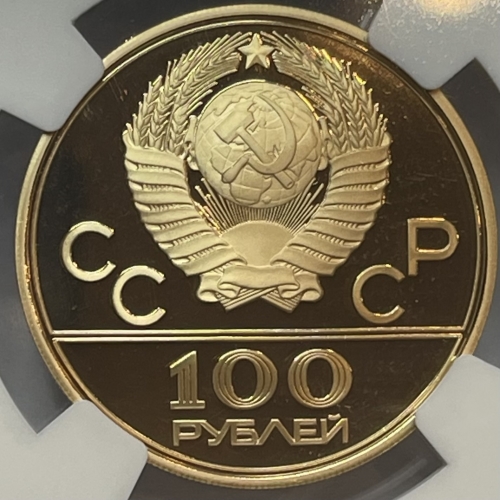 Сверху герб СССР с 15 витками ленты, слева от него буквы «СС», справа «СР», ниже двойная черта, под ней обозначение достоинства монеты цифра «100» и ниже слово «РУБЛЕЙ».