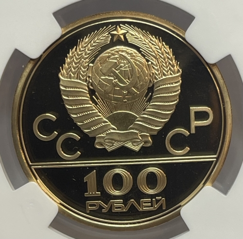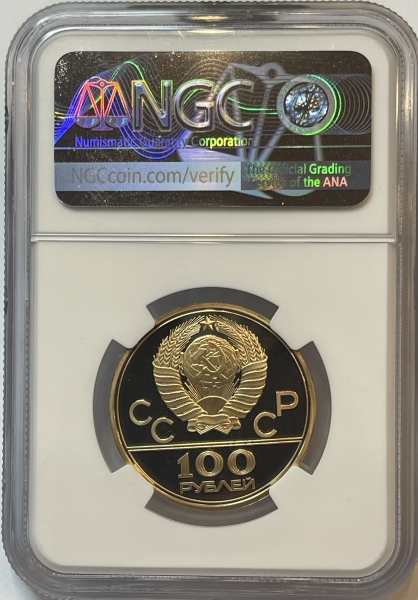 Сверху герб СССР с 15 витками ленты, слева от него буквы «СС», справа «СР», ниже двойная черта, под ней обозначение достоинства монеты цифра «100» и ниже слово «РУБЛЕЙ».