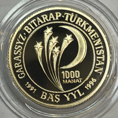 Золотая монета номиналом 1000 манат, выпущенная Туркменистаном в 1996, 916 проба, общий вес 7.98 грамм. Монета в закручивающейся капсуле. Чеканка Королевский Монетный Двор Великобритании. Родной Сертификат, Коробка. На монете изображен Сапармурат Ниязов также известный как Туркменбаши, был туркменским политиком, правившим Туркменистаном с 1985 года до своей смерти в 2006 году.