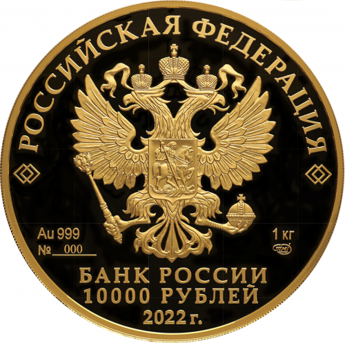рельефное изображение Государственного герба Российской Федерации, над ним вдоль канта — надпись полукругом: «РОССИЙСКАЯ ФЕДЕРАЦИЯ», обрамленная с обеих сторон сдвоенными ромбами, внизу под гербом в две строки: слева — обозначения драгоценного металла, пробы и порядковый номер монеты, справа — содержание химически чистого металла и товарный знак монетного двора, внизу в центре в три строки — надпись: «БАНК РОССИИ», номинал монеты: «10000 РУБЛЕЙ», год выпуска: «2022 г.».