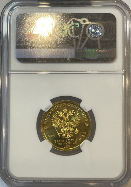 в центре – рельефное изображение Государственного герба Российской Федерации, над ним вдоль канта – надпись полукругом: "РОССИЙСКАЯ ФЕДЕРАЦИЯ", обрамленная с обеих сторон сдвоенными ромбами, внизу под гербом: слева – обозначения драгоценного металла и пробы, справа – содержание химически чистого металла и товарный знак монетного двора, внизу в центре – надпись в три строки: "БАНК РОССИИ", номинал монеты: "50 РУБЛЕЙ", год выпуска: "2018 г.".