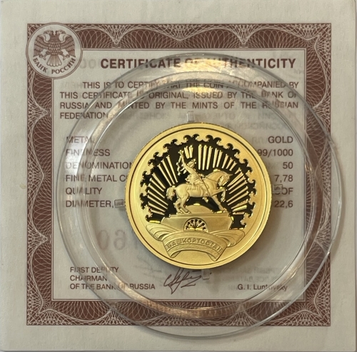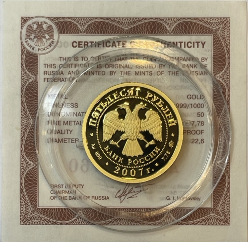 в центре – эмблема Банка России (двуглавый орёл с опущенными крыльями, под ним – надпись полукругом «БАНК РОССИИ»), обрамленная кругом из точек и надписями по кругу – вверху: «ПЯТЬДЕСЯТ РУБЛЕЙ», внизу: слева – обозначения драгоценного металла и пробы сплава, в центре – дата выпуска «2007 г.», справа – содержание химически чистого металла и товарный знак монетного двора.