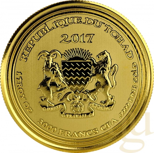 Аверс: На аверсе изображен герб республики Чад. По ободу кругом размещены следующие надписи: «REPUBLIQUE DU TCHAD 1 TROY OZ .9999 GOLD 3000 FRANCS CFA» (страна-эмитент – республика Чад, вес чистого золота – 1 тройская унция, проба – 0,9999, номинал – 3000 африканских франков). По центру выше герба указан год выпуска монеты – «2017».