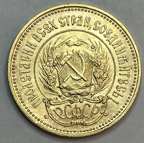Одновременно с выпуском бумажных червонцев, в октябре 1922 года было принято решение о выпуске золотых червонцев в виде монет. По своим весовым характеристикам (8,6 г, 900 проба) и размерам червонец полностью соответствовал дореволюционной монете в 10 рублей. Автором рисунка стал главный медальер монетного двора А. Ф. Васютинский (также автор окончательного варианта ордена Ленина и первого значка ГТО). На аверсе монеты был изображён герб РСФСР; на реверсе — крестьянин-сеятель, выполненный по скульптуре И. Д. Шадра (натурщиками были два крестьянина деревни Праговая Шадринского уезда Перфилий Петрович Калганов и Киприян Кириллович Авдеев), ныне находящейся в Третьяковской галерее. Монета была отчеканена на Петроградском монетном дворе в 1923 году тиражом 2 751 000 экземпляров.[3]