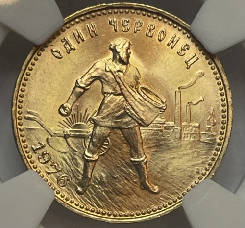 Изображение крестьянина-сеятеля на фоне плуга, восходящего солнца и заводов; по краю монеты точки, вверху надпись - «ОДИН ЧЕРВОНЕЦ», внизу слева — год выпуска - 1976.