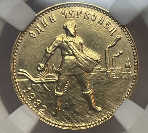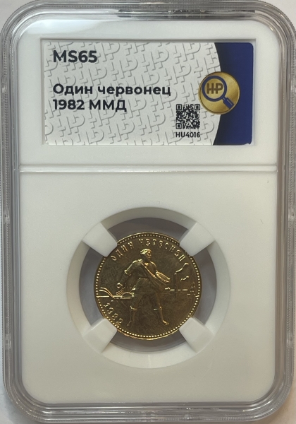 Изображение крестьянина-сеятеля на фоне плуга, восходящего солнца и заводов; по краю монеты точки, вверху надпись - «ОДИН ЧЕРВОНЕЦ», внизу слева — год выпуска - 1982.
