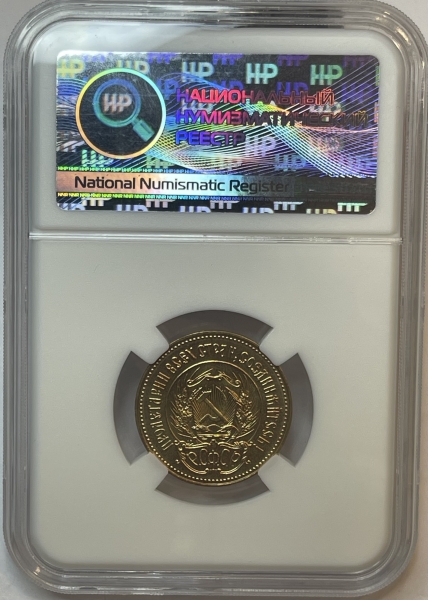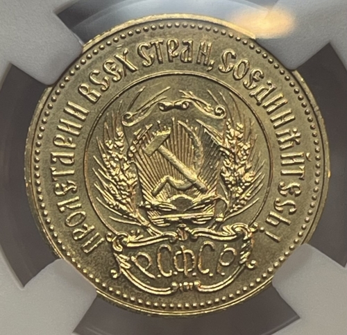 Герб РСФСР, окруженный венком из колосьев, и щит с изображением на нем серпа и молота на фоне солнечных лучей; по краю монеты точки вдоль них надписи: сверху - «ПРОЛЕТАРИИ ВСЕХ СТРАН, СОЕДИНЯЙТЕСЬ!», внизу под гербом - «Р. С. Ф. С. Р.».