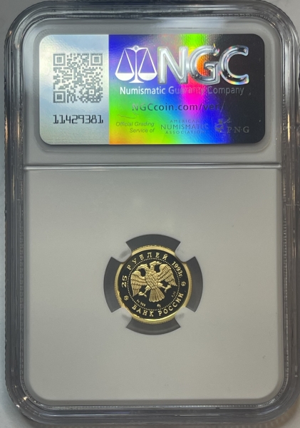 в центре диска - эмблема Банка России (двуглавый орёл художника И. Билибина), под ним: слева - обозначение металла, проба сплава, в центре - товарный знак монетного двора, справа - содержание драгоценного металла в чистоте. По окружности надписи, обрамлённые кругом из точек: вверху - "25 РУБЛЕЙ 1993 г.", внизу - "БАНК РОССИИ".