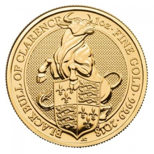 Реверс: На реверсе золотой инвестиционной монеты "Черный бык" - изображение быка, держащего в лапах щит. По кругу монеты - надписи на английской языке, обозначающие "Черный бык Кларенса", 1 тройская унция чистого золота 999,9 пробы. Далее идет год выпуска монеты - 2018. Снизу, под изображением быка, указаны инициалы дизайнера монеты - JC (Jody Clark).