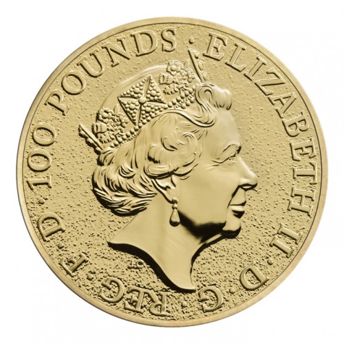 На аверсе золотой инвестиционной монеты "Лев Англии" - портрет Ее Величества Королевы Елизаветы II, выполненный Джоди Кларком, представленный на британских монетах с 2015 года (так называемый пятый тип монетного портрета королевы). По краю монеты расположены надписи, указывающие номинал монеты и имя Королевы: 100 POUNDS / ELIZABETH II / D / G / REG / F / D.
