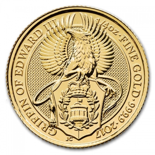 Золотой Королевский Гриффон это вторая золотая монета в серии "Звери королевы" Монета 2017 года номиналами в 100 и 25 фунтов и весом в 1 и 1/4 тройскую унции. Монета продолжает серию десяти геральдических статуях, связанных с родословной королевы Елизаветы II. Монета Королеский Гриффон Эдварда III состоит из геральдического зверя, находящегося над щитом, на котором изображены знаки связанные с королем Эдуардом III. Щит стоит по центру монеты с циркулирующей надписью на левой стороне - GRIFFIN OF EDWARD III. Монета разработана Королевским монетным двором Великобритании, художник Джоди Кларк. Вес 1/4 унции составляет 7,8 грамма и диаметром 22 мм, при номинале 25 фунтов. Чистота золотых монет 999,9.