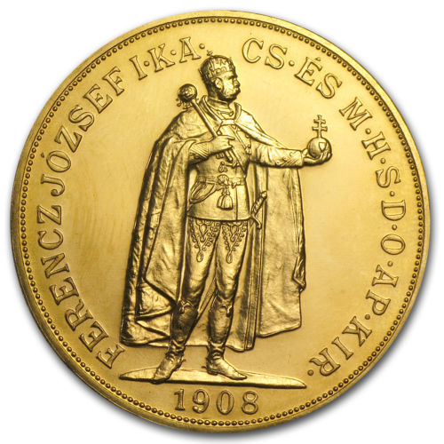 Аверс: Изображение император Австрийской империи - Франц-Иосиф I, с короной на голове, а в руках символы монархической власти: скипетр и держава. Под ногами стоящего монарха год выпуска монеты "1908". Верхняя круговая надпись: "FERENCZ JOZSEF I•K•A• CS•ES M•H•S•D•O•AP•KIR•"