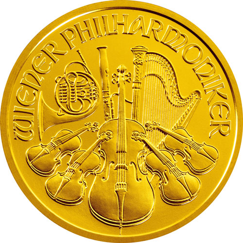 Вверху полукругом надпись на немецком языке - "венская филармония". Венская филармония – золотая монета 99,99-процентной пробы (0,9999). При диаметре в 37 мм монета весом в одну унцию является самой крупной среди всех золотых монет мира. Выпускается четыре монеты разного веса с одним и тем же оформлением. До введения евро в 2002 году номинал золотой монеты обозначался в австрийских шиллингах. Номинал монеты носит символический характер. Стоимость монеты определяется дневными ценами на золото на Нью-йоркской товарной бирже или Лондонской бирже металлов. К двадцатой годовщине в 2009 году по всему миру было продано около 12 миллионов таких монет.